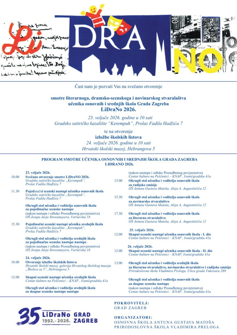 pozivamo vas na svečano otvorenje Smotre literarnoga, dramsko – scenskog i novinarskog stvaralaštva učenika osnovnih i srednjih škola Grada Zagreba – LiDraNo 2026., koje će se održati u ponedjeljak 23. veljače 2026. godine u 10,00 sati u Gradskom satiričkom kazalištu „Kerempuh“, Prolaz Fadila Hadžića 7.